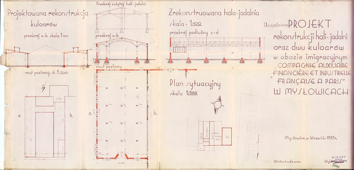 Zachowany projekt przebudowy hali (baraku) - jadalni "Compagnie Auxiliaire Financiere et Industrielle Francaise a Paris" z 1937 roku