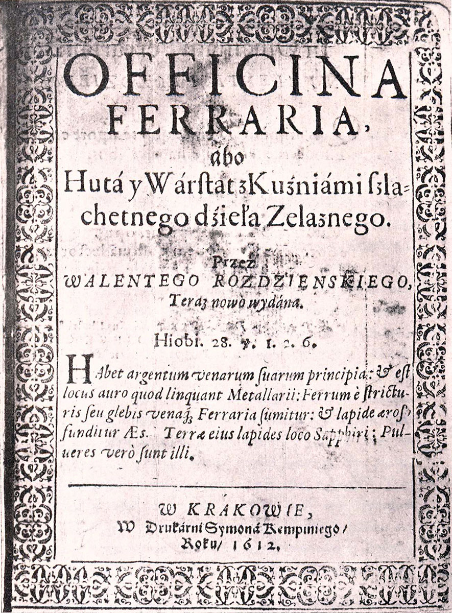 Bądź jak bądź Roździeński musiał teraz mieć więcej wolnego czasu, tak że mógł się całkiem poświęcić pracy systematycznego zeszeregowania swoich wiadomości fachowych celem wydania w roku 1612 swojej cennej książki p. t. „Officina ferraria abo huta y warstat z kuźniami szlachetnego dzieła żelaznego”. Może wartość Roździeńskiego jako człowieka i gospodarza własnej kuźnicy nie przedstawia nam się w najlepszym świetle, jako autor książki jest on wprost nieoceniony. Książka Roździeńskiego przez przeszło 300 lat była nieznaną i dopiero w najnowszym czasie dało się ją odnaleźć w bibliotece kapitulnej w Gnieźnie i wyciągnąć na światło dzienne. Narazie dał się tylko ten jeden egzemplarz odgrzebać i dlatego nazywać go musimy unikatem. Jest to poemat poważny, bo obejmujący przeszło 2040 wierszy, dzieło bardzo wielkiej wartości fachowej zawierające mnóstwo praktycznych i interesujących szczegółów. Żaden z dawniejszych autorów książek o hutnictwie nie może się równać z Roździeńskim, kuźnikiem rodzonym i zamiłowanym zawodowcem, żaden z nich o „gospodarstwie kuźniczem” tylu wiadomości opartych na doświadczeniu nie przekazał, żaden z taką biegłością o tych sprawach nie pisał. Książkę Roździeńskiego otwiera nieco rozwlekły wstęp zawierający wierzenia pogan w różnych bożków trudniących się i opiekujących się hutnictwem. Zasadnicza część utworu pochodzi już nie z naukowego podłoża, ale z przeżyć, doświadczeń i rozmyślań autora. I to właśnie decyduje o trwałej wartości książki. Tą prawdą przeżyć, jakby krwią żywą, zaczyna tętnić utwór Roździeńskiego z chwilą, kiedy od dziejów hutnictwa w obcych krainach przechodzi on na swój rodzinny Śląsk. Słuchamy go wtedy z rosnącą ciekawością, dowiadujemy się co krok szczegółów gdzieindziej nie zanotowanych; z opowieści wyłaniają się legendarne postacie najdawniejszych śląskich kuźników, przewijają się przez karty wątki podań hutniczych o Freszlu, odartym ze skóry przez szatana, o Szarleju, duchu kopalnianym, który ze zemsty za doznaną obrazę kopalnie kruszczu przy Bytomiu zatopił, o latawcach i ubożach (skarbnikach). A kiedy potem Roździeński od historii, powieści i legendy przechodzi do szczegółowego opisu gospodarstwa kuźniczego, kiedy jako rzetelny znawca praktyk w swoim zawodzie rozmiłowany kreśli tok pracy w hucie, kiedy przedstawia zajęcie dymarzy, kowali, koszytarzy i węgielników, wtedy jeszcze bliższym staje się czytelnikowi ten świat twardej pracy. Wyrasta przed oczami skąd inąd „nieznany kraj” utrwalony tutaj bez górnych literackich pretensyj, odtworzony z całą prostotą, powagą i przejęciem się dla hutniczej braci, głosi szlachectwo pracy, wynosi szarego górnika i hutnika z nizin zapomnienia i poniżenia.