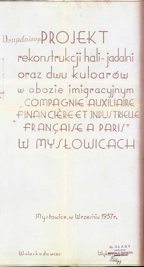 Zachowany projekt przebudowy hali (baraku) - jadalni "Compagnie Auxiliaire Financiere et Industrielle Francaise a Paris" z 1937 roku
