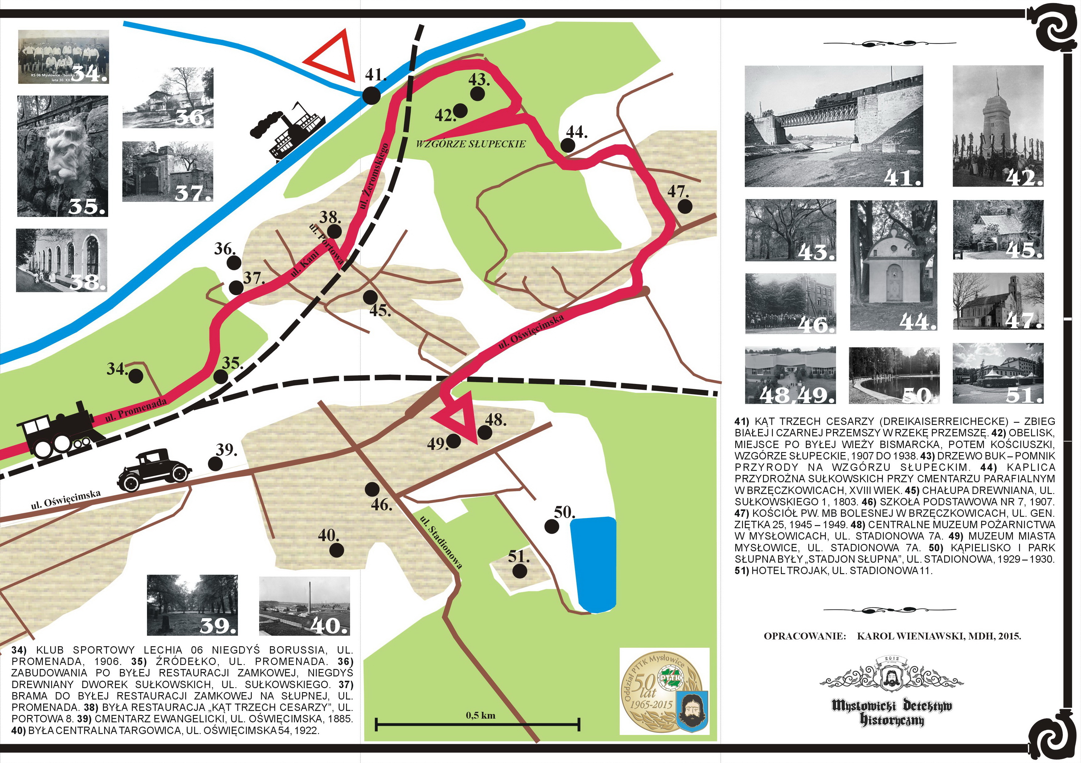 Udostępniamy Wszystkim do niekomercyjnego, prywatnego użytku, specjalną prostą mapkę z naniesioną propozycją trasy spacerowej po Mysłowicach. Oczywiście trasę dowolnie można sobie konfigurować, wg własnych potrzeb i chęci. Można ją np. wydłużyć o Park Zamkowy albo skrócić, np. dochodząc do samego Trójkąta Trzech Cesarzy (TTC). Niemniej jednak proponowana trasa wydaje się optymalną i najciekawszą. Długość całej trasy od Rynku, przez Trójkąt Trzech Cesarzy z finałem w Muzeum Miasta Mysłowice oraz Centralnym Muzeum Pożarnictwa na Słupnej, to ok 5 km, czas przejścia w spokojnym tempie wraz z podziwianiem walorów historyczno-turystycznych Mysłowic, to 2-3 godziny. Zakończywszy ją np. na Wzgórzu Słupeckim za Trójkątem Trzech Cesarzy trasa skraca się do ok 3,5km. Oczywiście należy również zaplanować przybycie na Rynek oraz powrót do domu. Teren jest dość prosty i typowo rekreacyjny. Nieco bardziej należy się wysilić przechodząc pomiędzy mostami na Trójkącie Trzech Cesarzy, jest tam jedno strome zejście, a tuż za mostami czeka nas wejście na Wzgórze Słupeckie.