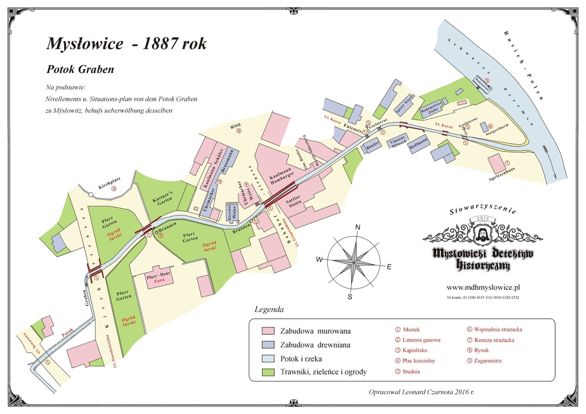 Potok płynie w tym samym miejscu do dzisiaj pod naszymi nogami ale już o nim nie pamiętamy. Plan sytuacyjny jest bardzo ciekawy i dla znawców tematu będzie na pewno sporym zaskoczeniem. W 1887 roku stał jeszcze drewniany dom w którym to urzędował zegarmistrz Brossmann, a obecna ulica Grunwaldzka nazwana była Dworcową...