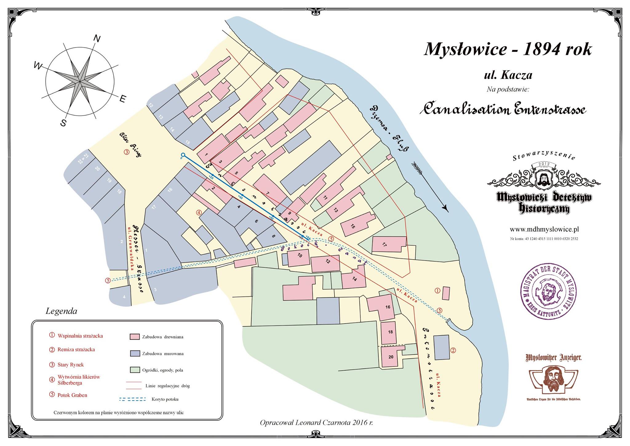 Ulica Kacza w 1894 roku. W tym czasie potok płynący wzdłuż ulicy został "zamknięty w rurę". Na planie zaznaczona jest wspinalnia i remiza strażacka oraz koryto potoku z nowym odcinkiem kanalizacji.