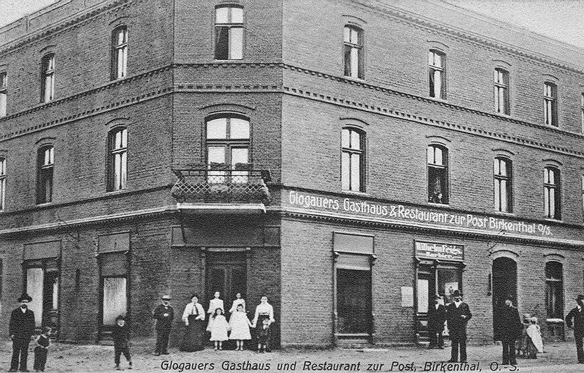 W tamtym czasie budynek znajdował się u zbiegu ówczesnych dróg: „chaussee nach Carlssegen” - Carlssegenstrasse (dzisiejsza ul. Laryska) i „chaussee nach Kostow” - Kaiser Wilhelm strasse (dzisiejsza ul. Brzezińska). W następnych latach Glogauerowie dokonali kilku przebudów pomieszczeń oraz rozbudowali budynki gospodarcze na jego tyłach. W 1907 roku dobudowali stajnię dla gości.