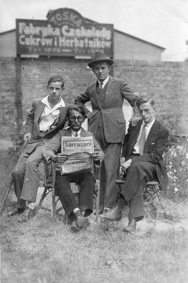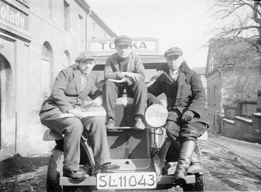 Właściciele Toski we wspólnym zdjęciu na ul. Jagiellońskiej przy bramie wjazdowej do fabryki.