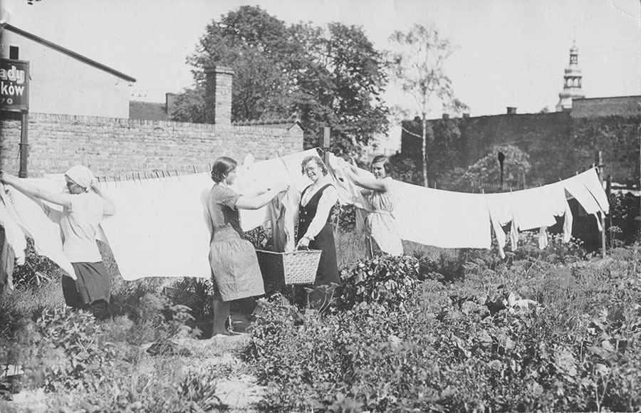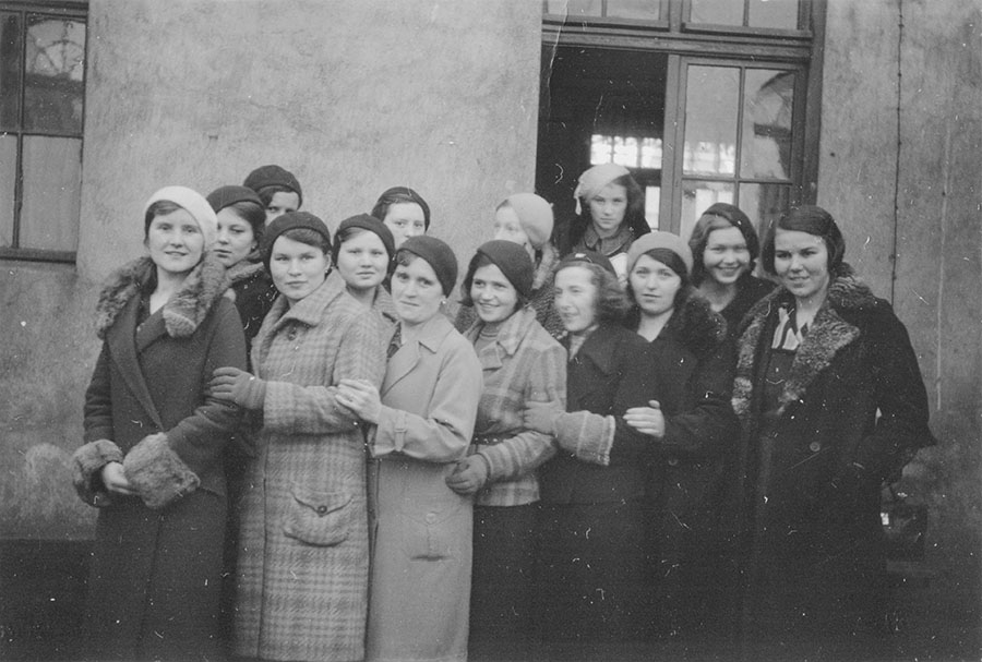 Helena we wspólnym zdjęciu wraz pracownicami w podwórzu fabryki.