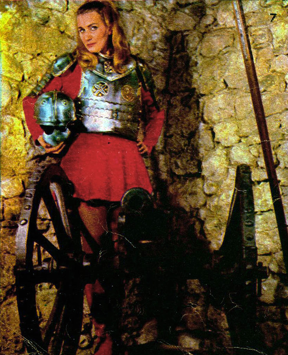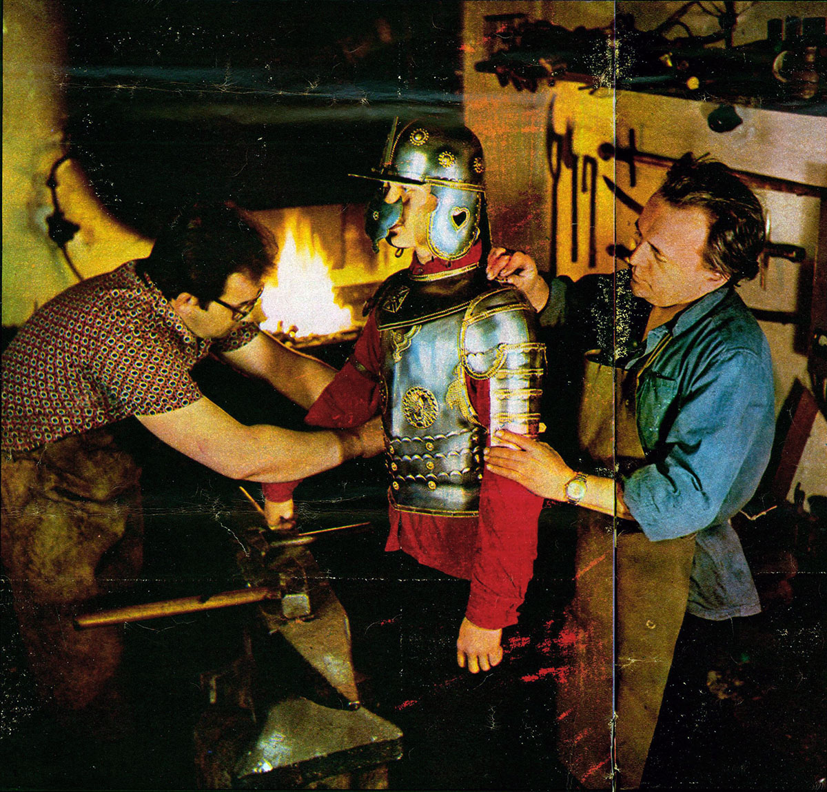 Oczywiście zbroja musiała być odpowiednio majestatyczna, nie tylko w kształcie, ale i w barwie. Żaden lakier nie da właściwego połysku; nasi majstrowie dwudziestowieczni płatnerze ze Śląska, odszukali starą receptę niegdysiejszych kowali, sposób na to, by blachy nabrały głębokiej czerni z pysznym, opalizującym poblaskiem. Należało rozpalony do czerwoności puklerz nacierać pracowicie... końskim kopytem ! Co przy tym wycierpieli sami twórcy (i zapewne ich sąsiedzi), trudno orzec. Jedynie koniowi, dawcy kopyta, było wszystko jedno, bo był przecież nieboszczykiem, lecz żywi musieli przeżywać ciężkie męki węchowe. Niemniej dzieło powstało jak niegdyś i na barwnym ekranie zalśni należytym kolorem.”...