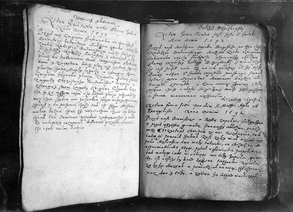 Księga zaczyna się w roku 1590. A jest to związane z tym, że około 1587 roku Mysłowice zostały spalone. Krótko... Wojska polskie wkroczyły na teren Mysłowic w związku z wyprawą przeciwko pretendentowi do polskiego tronu Maksymilianowi. Potem była bitwa pod Byczyną. Bliżej jakiś oddział polski się okopał. Na pewno Mysłowice nie chciały płacić kontrybucji – mieszkańcy nie chcieli utrzymywać tego wojska. Doszło do awantury – do strzelaniny – i Mysłowice spłonęły. A ponieważ ratusz stał na Rynku – był drewniany – to razem z Ratuszem spłonęły księgi. Ż były wcześniejsze księgi, to są trzy przykłady w „Czerwonej Księdze”, gdzie powołuje się pewien interesant, który przychodzi spisać to swoje odewzdanie na rzecz swojego syna. I zaznacza dokładnie, że to już było zapisane w księgach, które „przez ogień zgorzały”. I w którymś miejscu jest napisane, że Polacy miasto spalili.