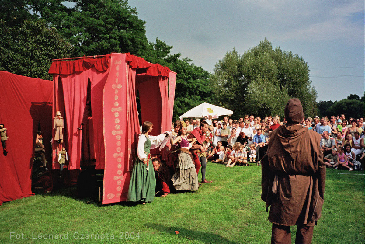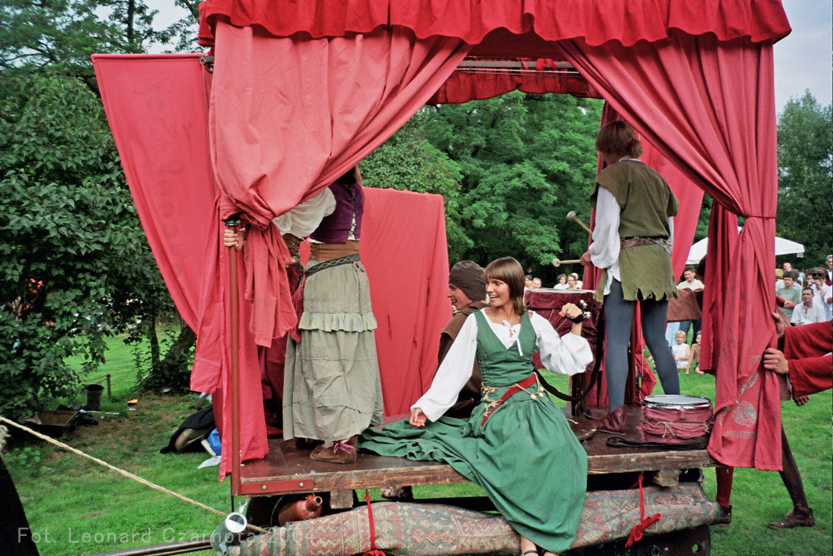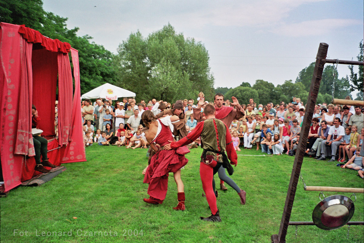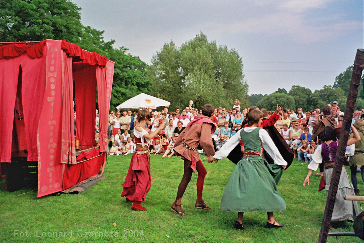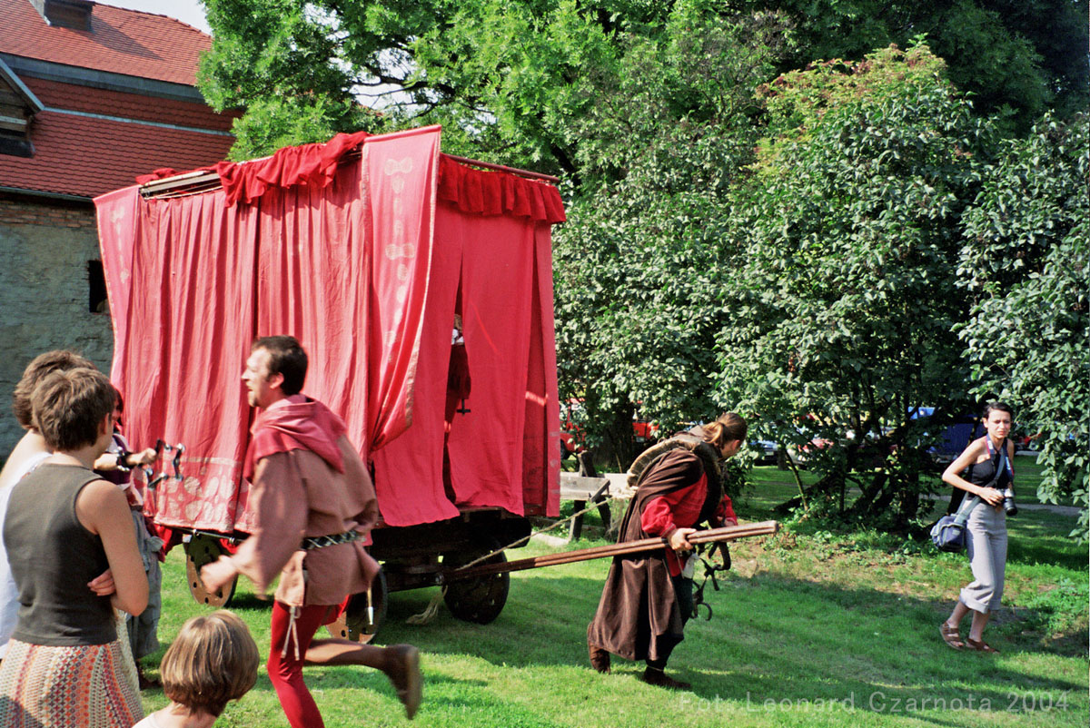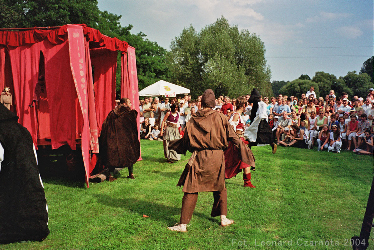 Przedstawienie trupy teatralnej z Zabrza przy spichlerzu w Chudowie, opodal zamku rycerskiego.