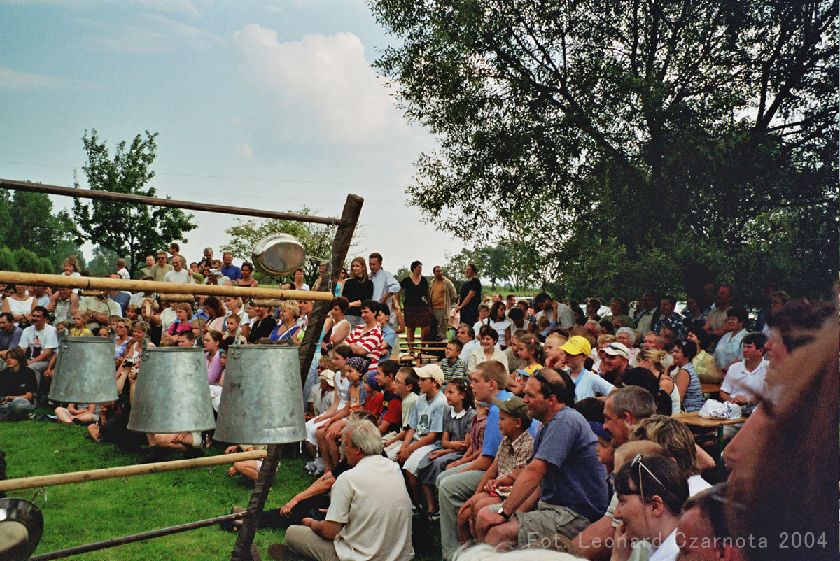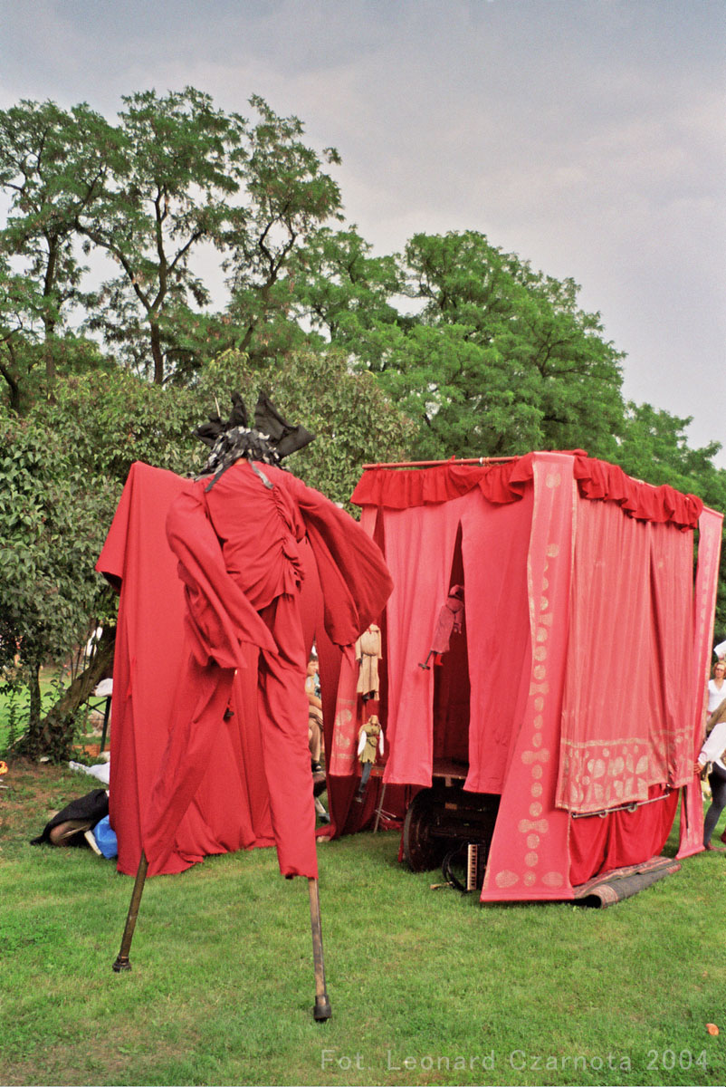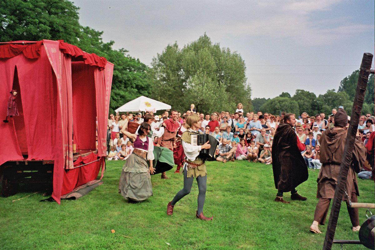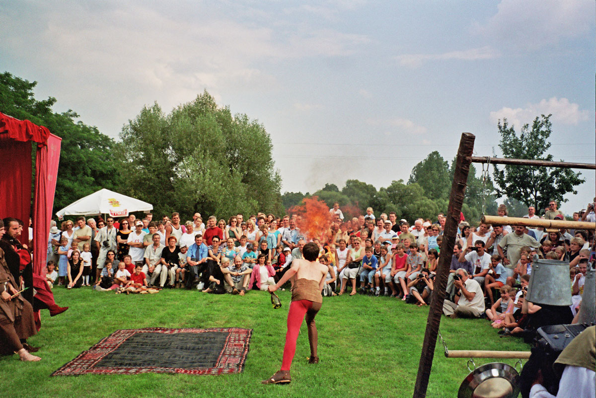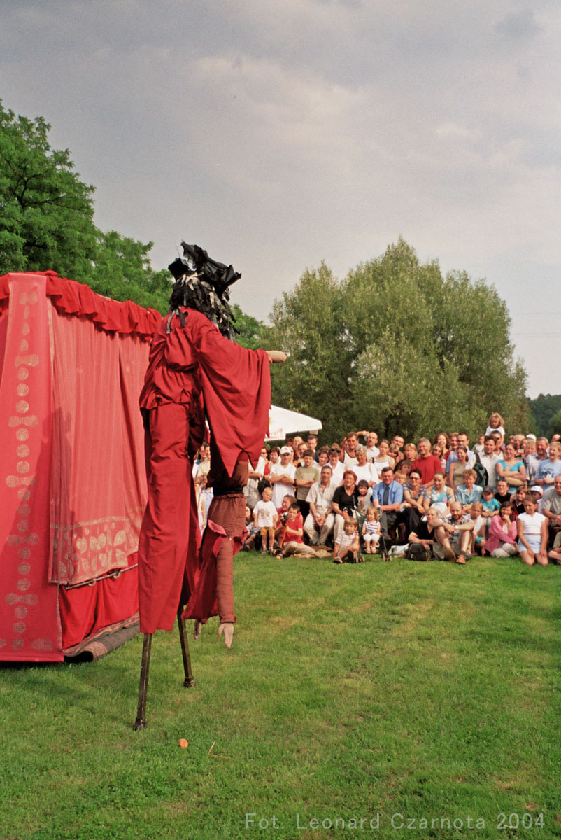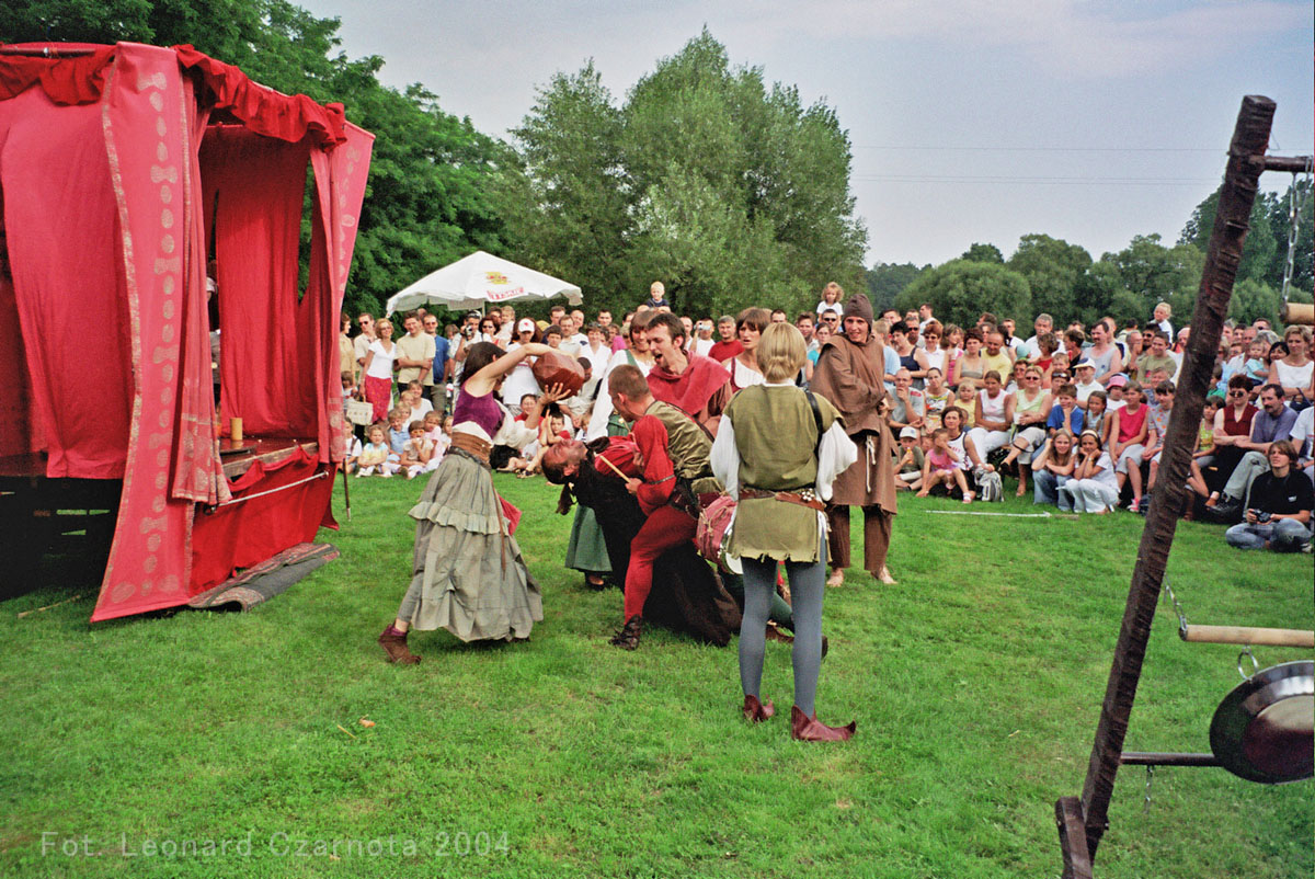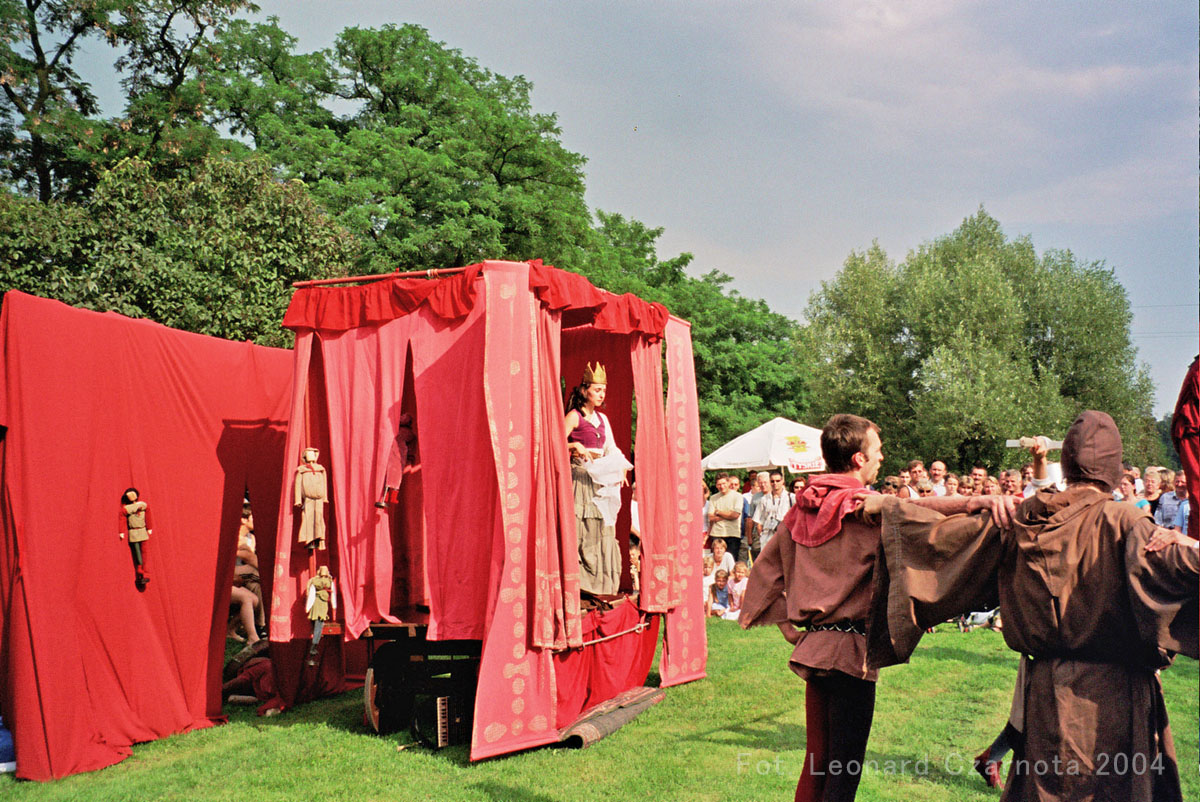 Przedstawienie trupy teatralnej z Zabrza przy spichlerzu w Chudowie, opodal zamku rycerskiego.