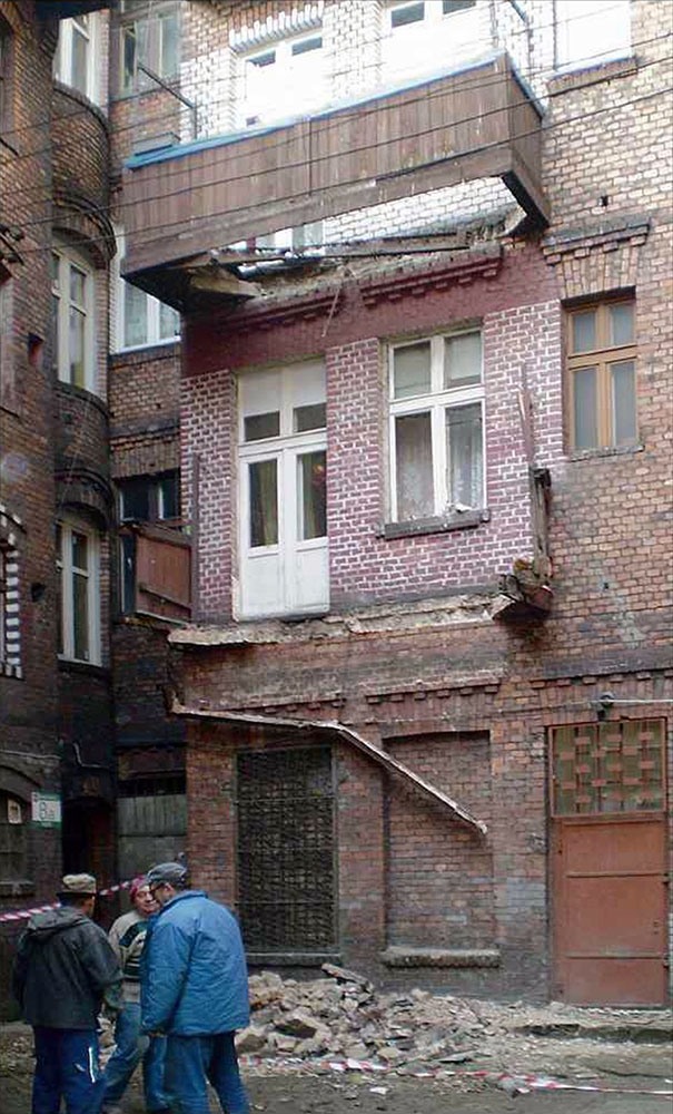 Pod ciężarem cegieł z balkonu na II piętrze zawalił się również balkon na niższej kondygnacji.
