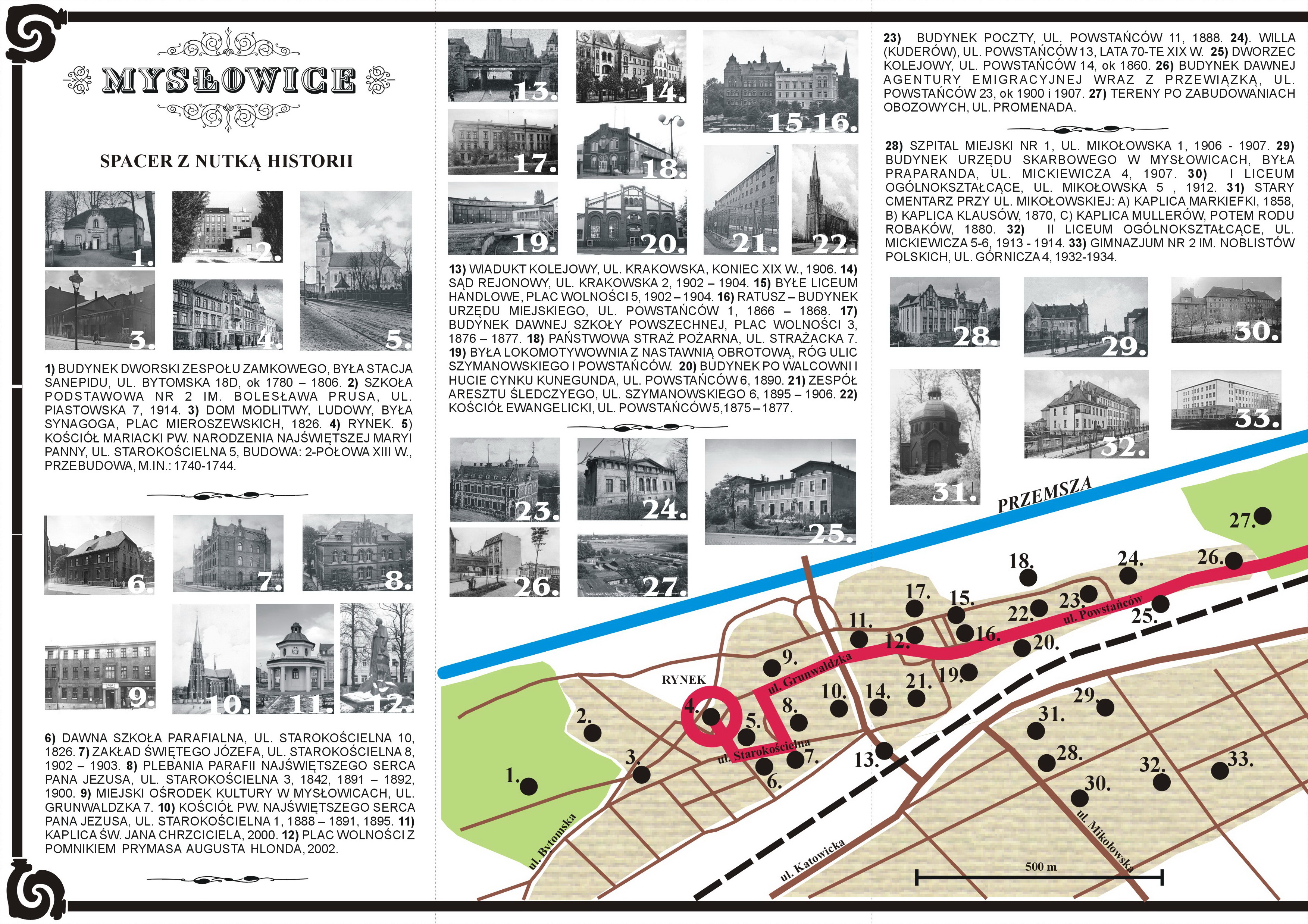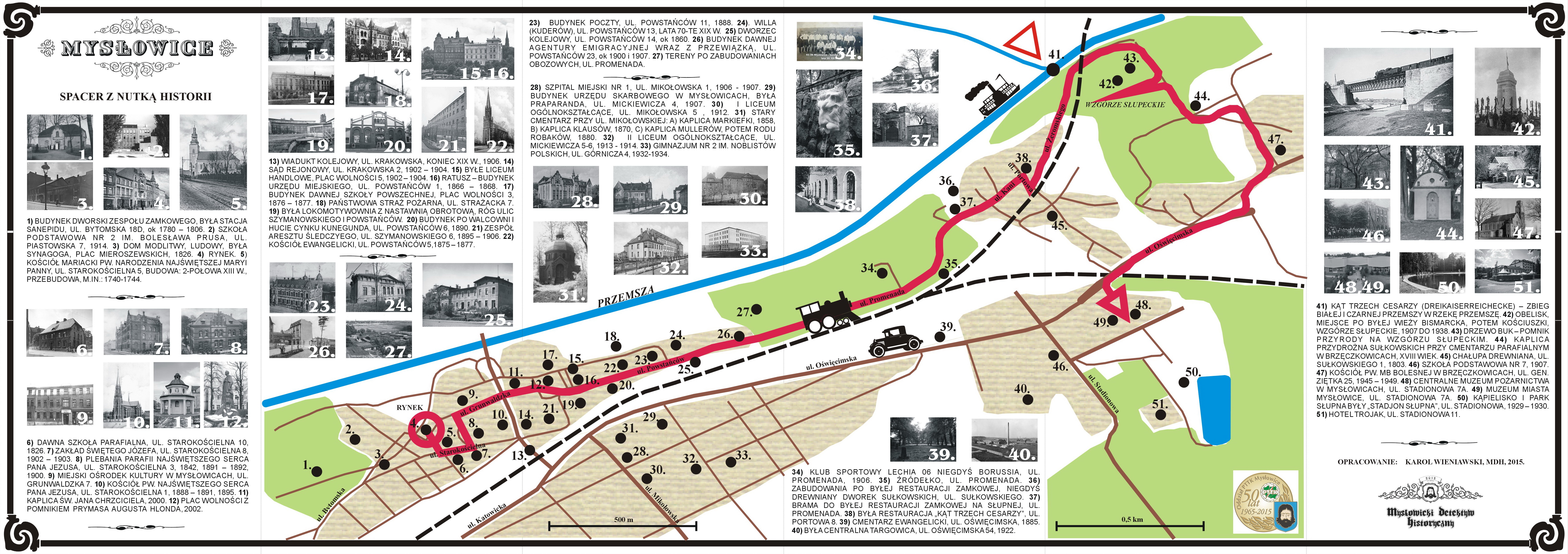 Udostępniamy Wszystkim do niekomercyjnego, prywatnego użytku, specjalną prostą mapkę z naniesioną propozycją trasy spacerowej po Mysłowicach. Oczywiście trasę dowolnie można sobie konfigurować, wg własnych potrzeb i chęci. Można ją np. wydłużyć o Park Zamkowy albo skrócić, np. dochodząc do samego Trójkąta Trzech Cesarzy (TTC). Niemniej jednak proponowana trasa wydaje się optymalną i najciekawszą. Długość całej trasy od Rynku, przez Trójkąt Trzech Cesarzy z finałem w Muzeum Miasta Mysłowice oraz Centralnym Muzeum Pożarnictwa na Słupnej, to ok 5 km, czas przejścia w spokojnym tempie wraz z podziwianiem walorów historyczno-turystycznych Mysłowic, to 2-3 godziny. Zakończywszy ją np. na Wzgórzu Słupeckim za Trójkątem Trzech Cesarzy trasa skraca się do ok 3,5km. Oczywiście należy również zaplanować przybycie na Rynek oraz powrót do domu. Teren jest dość prosty i typowo rekreacyjny. Nieco bardziej należy się wysilić przechodząc pomiędzy mostami na Trójkącie Trzech Cesarzy, jest tam jedno strome zejście, a tuż za mostami czeka nas wejście na Wzgórze Słupeckie.
