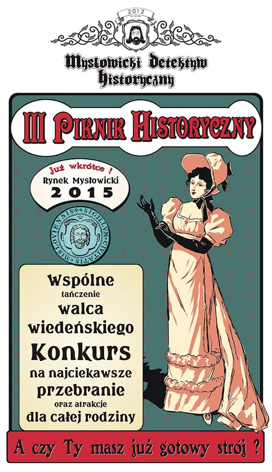 Jest to konkurs na najciekawsze przebranie z przełomu XIX/XX w., którego finał oraz wręczenie nagród odbędzie się podczas 3. dnia Dni Mysłowic, tj. 21 czerwca 2015 r. podczas III Pikniku Historycznego. Jeśli oglądaliście „Titanica” i „Noce i Dnie”… Jeśli czytaliście „Nad Niemnem” i „Ziemię Obiecaną”… Przywróćmy na chwilę słynną belle epoque! Zapraszamy wszystkich chętnych do wspólnej zabawy. Przebierzmy się w stroje z epoki i spotkajmy się 21 czerwca o godz. 12.00 w Mysłowicach pod Przewiązką (ul. Powstańców). Spod Przewiązki przy dźwiękach walca wiedeńskiego przejdziemy w orszaku na mysłowicki Rynek, gdzie będzie odbywał się III Piknik Historyczny – 3 Dzień Dni Mysłowic i tam rozstrzygnie się finał konkursu.